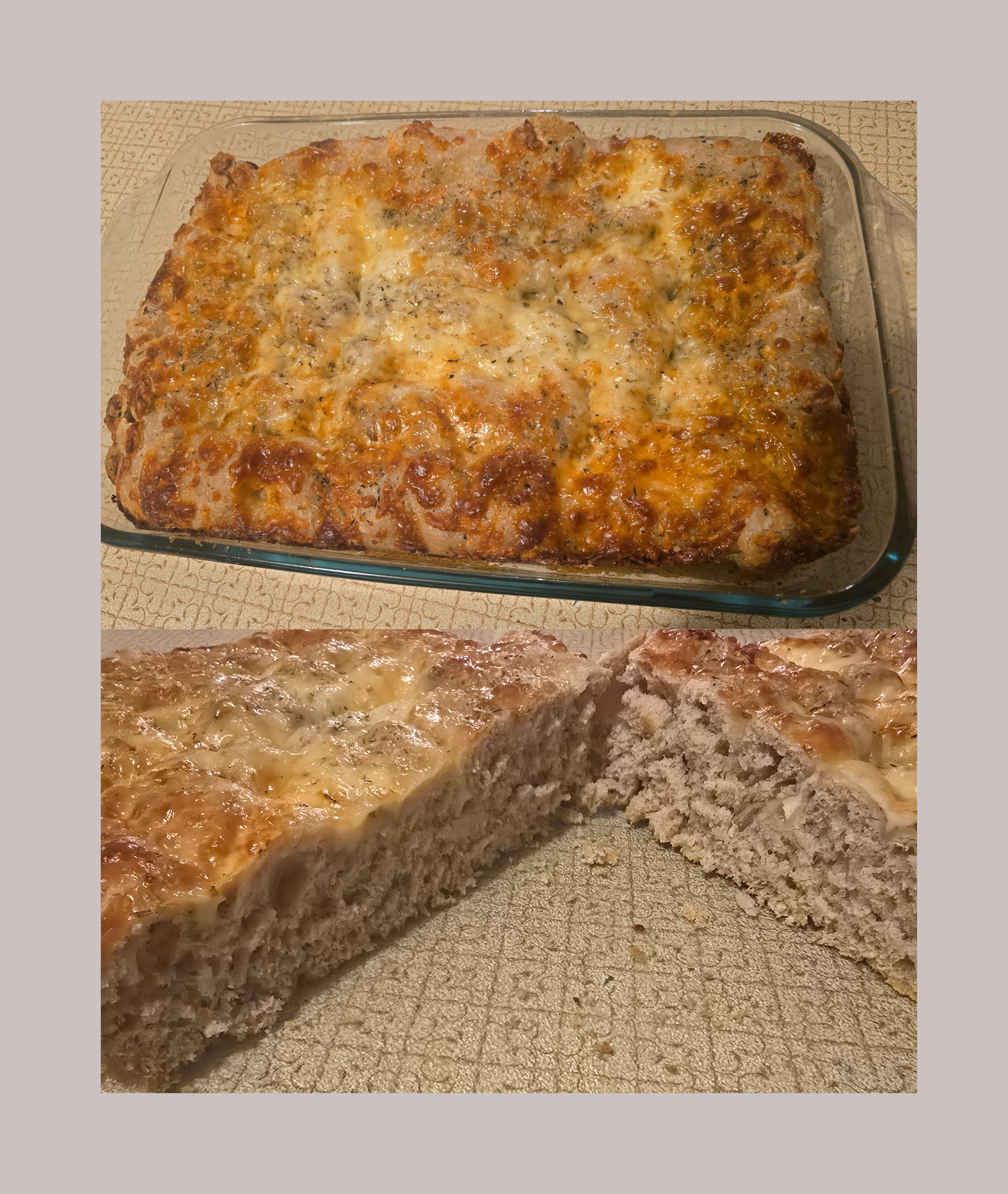 Bring the taste of artisan bread to your table with our homemade focaccia, crafted from a year-old starter for exceptional flavor and texture. Each loaf is made with simple, natural ingredients—flour, water, salt, olive oil, and our living starter—and generously topped with creamy mozzarella cheese and fragrant herbs.